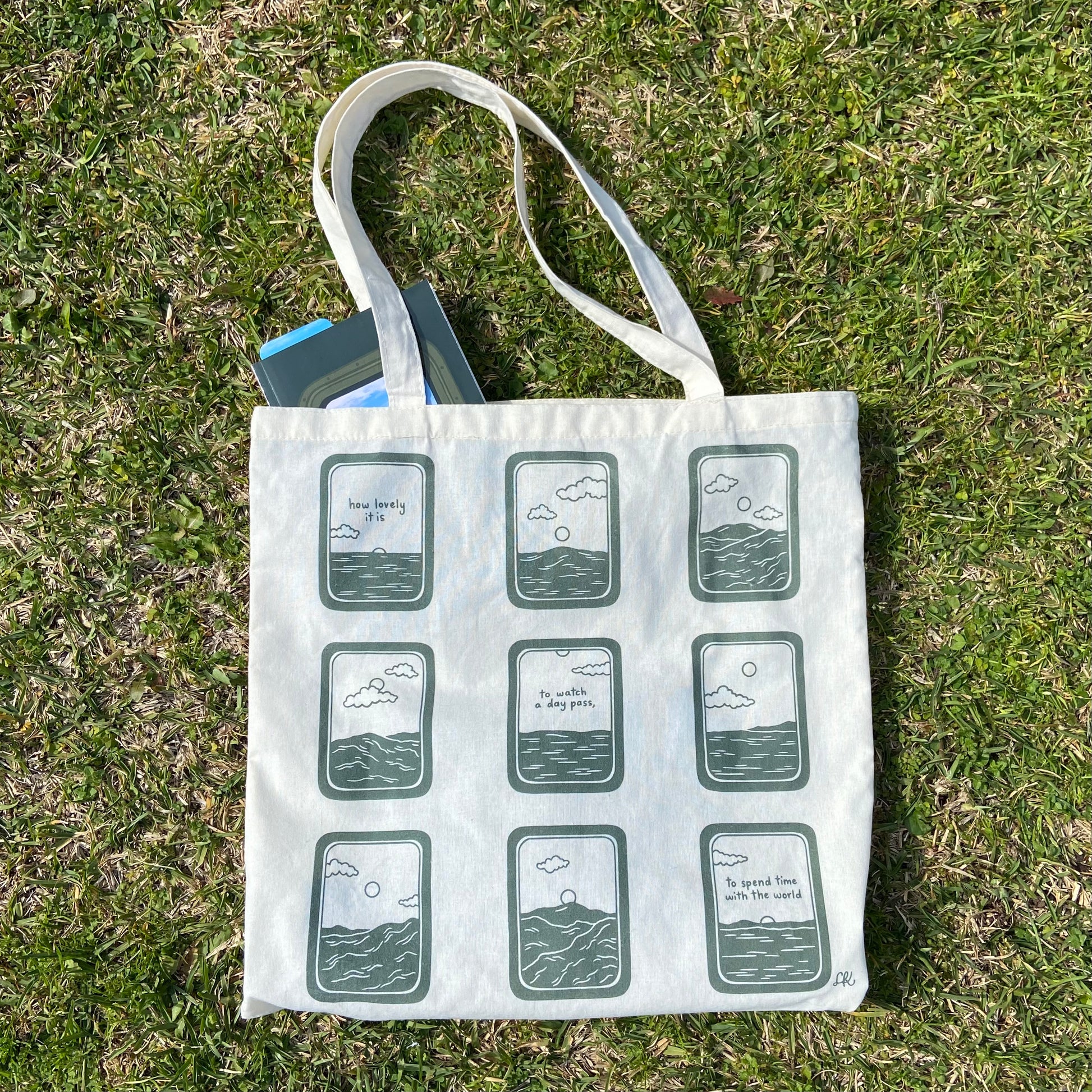 Bag reads: how to lovely it is, to watch a day pass, to spend time with the world.
